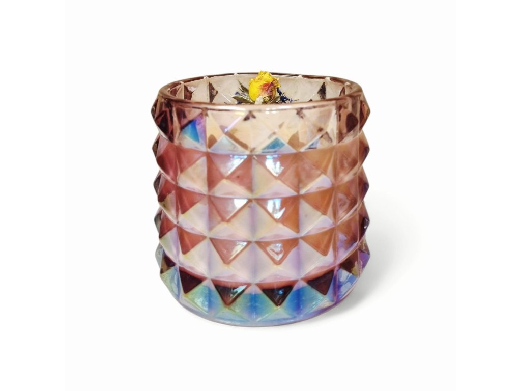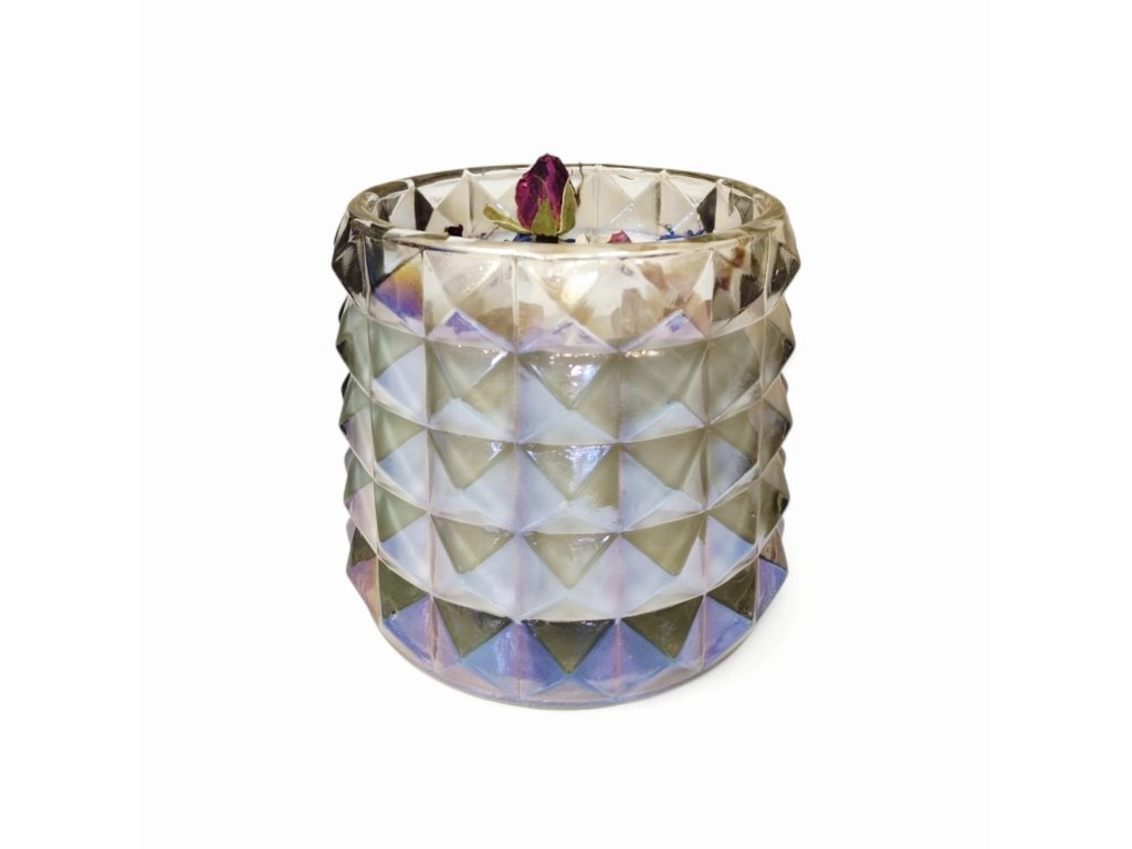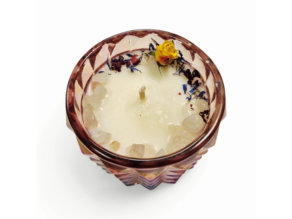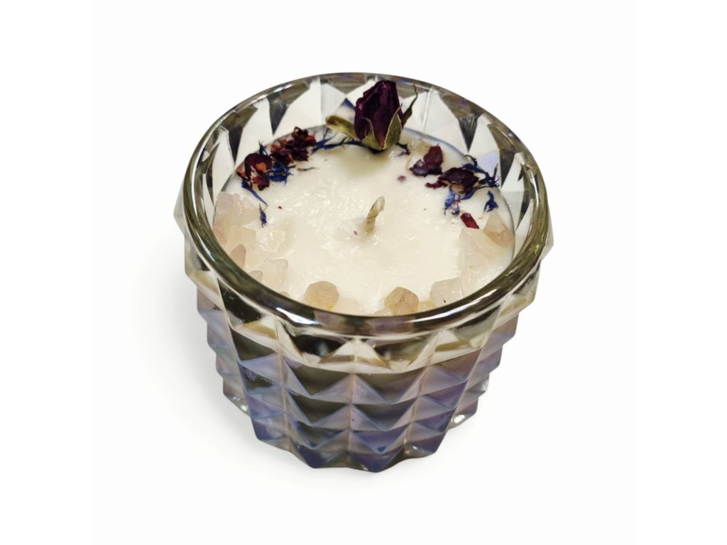 Hľadáte romantický darček na Valentína? Naša luxusná sviečka z prírodného sójového vosku o hmotnosti 250 g je ideálnym riešením. Sviečka je umiestnená v elegantnom pohári s perleťovou úpravou a ručne dozdobená jemnými kryštálikmi ruženínu, ktoré symbolizujú lásku, harmóniu a pokojné vibrácie.